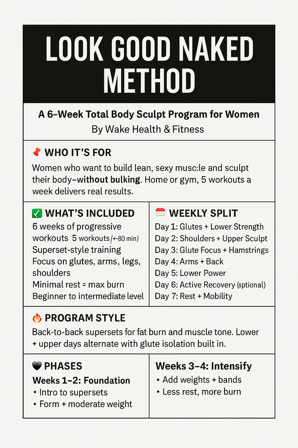 • 5 Workouts Per Week: Total-body and split routines tailored for women.
